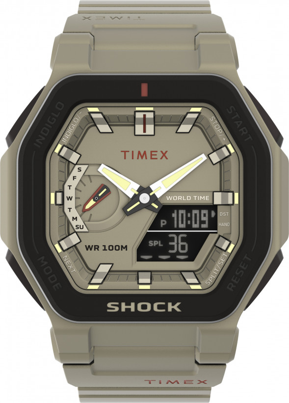 противоударный корпус, хронограф, таймер, секундомер, будильник, люминесцентные стрелки и индексы, время 48 городов мира, подсветка INDIGLO